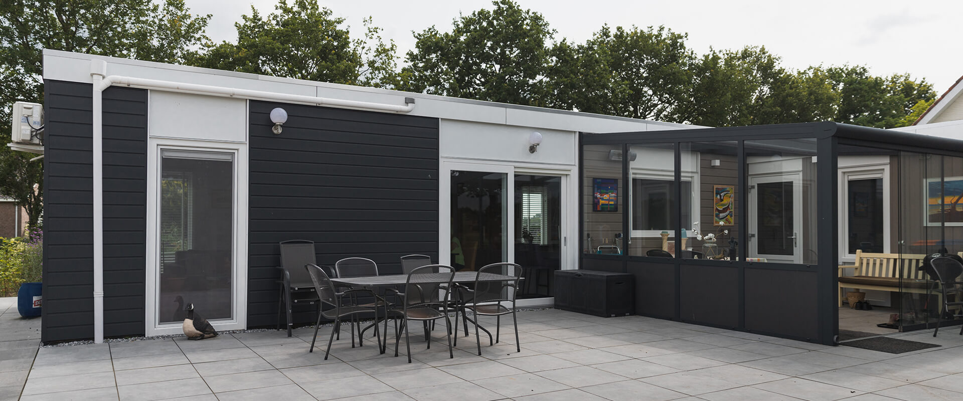 Een mantelzorgwoning van Thuis aan Huis is een complete, zelfstandige woning die tijdelijk naast een ander huis wordt geplaatst. Het gebruik van eigentijdse en duurzame materialen dragen bij aan het wooncomfort en de gewenste uitstraling. De woning is zo gemaakt dat wanneer de vraag naar zorg voor u groter wordt, aanpassingen eenvoudig gerealiseerd kunnen worden.